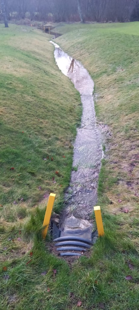 During the heavy downpours water has been running along the ground from the top of the hill at the 2nd,3rd and 8th and 9th into the ditches at the 4th and right of the 8th green, the ditch at the 8th hasn’t been able to cope and has been overflowing running onto the 4th green, the drain that runs into the ditch at the left of the 9th approach is also failing badly, as you can see in the video attached.